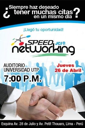 JCI Lima, conocida también como la Cámara Junior de Lima organizará el Tercer Encuentro Dinámico – Empresarial denominado Speed Networking. En estas ruedas de negocios de corta duración, se podrá ofrecer y encontrar servicios, cooperadores, productos, proveedores, proyectos e inversores.