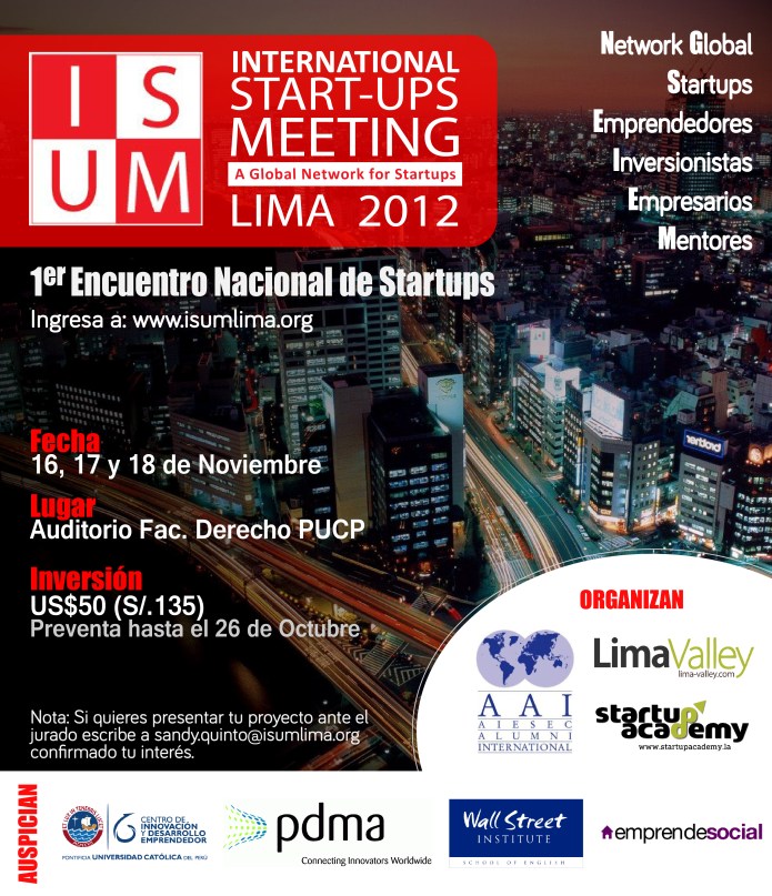 El primer encuentro nacional de Startups en Lima, llamado “International Start-Up Meeting” se realizará el próximo viernes 16, sábado 17 y domingo 18 de Noviembre en las instalaciones del Auditorio de Derecho de la Pontificia Universidad Católica del Perú, donde se presentarán casos exitosos de startups y emprendimientos locales e internacionales a más de 300 asistentes.